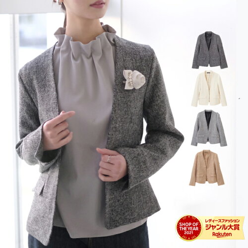 最新のおしゃれツイードジャケットは、ノーラペルというデザインです。